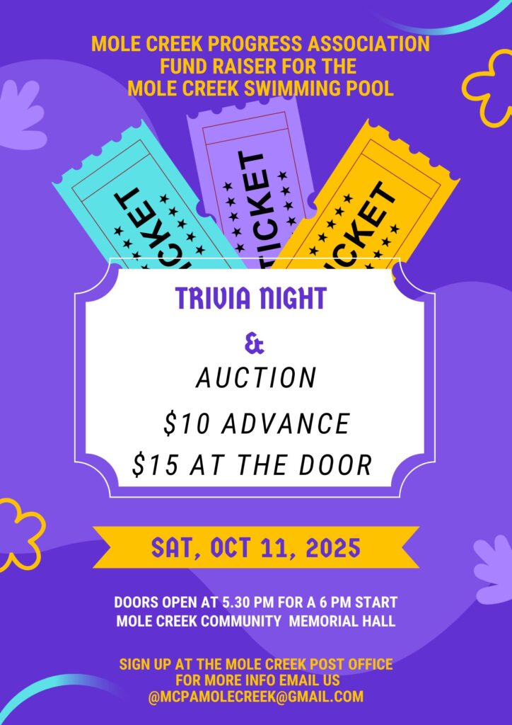 Support the Mole Creek Swimming Pool – join us for a fun night to be held at the Mole Creek Community Memorial Hall on Saturday, 11 October 2025.