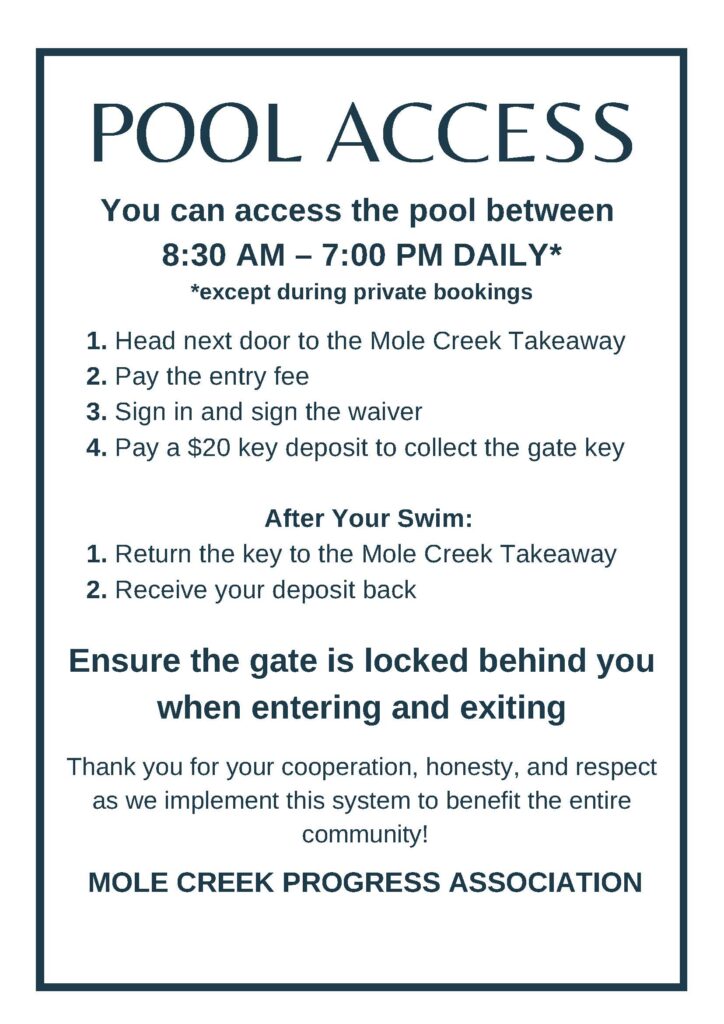 Safety: Use of the pool is at your own risk. By entering, you accept these conditions and waive legal claims against the Mole Creek Progress Association.
